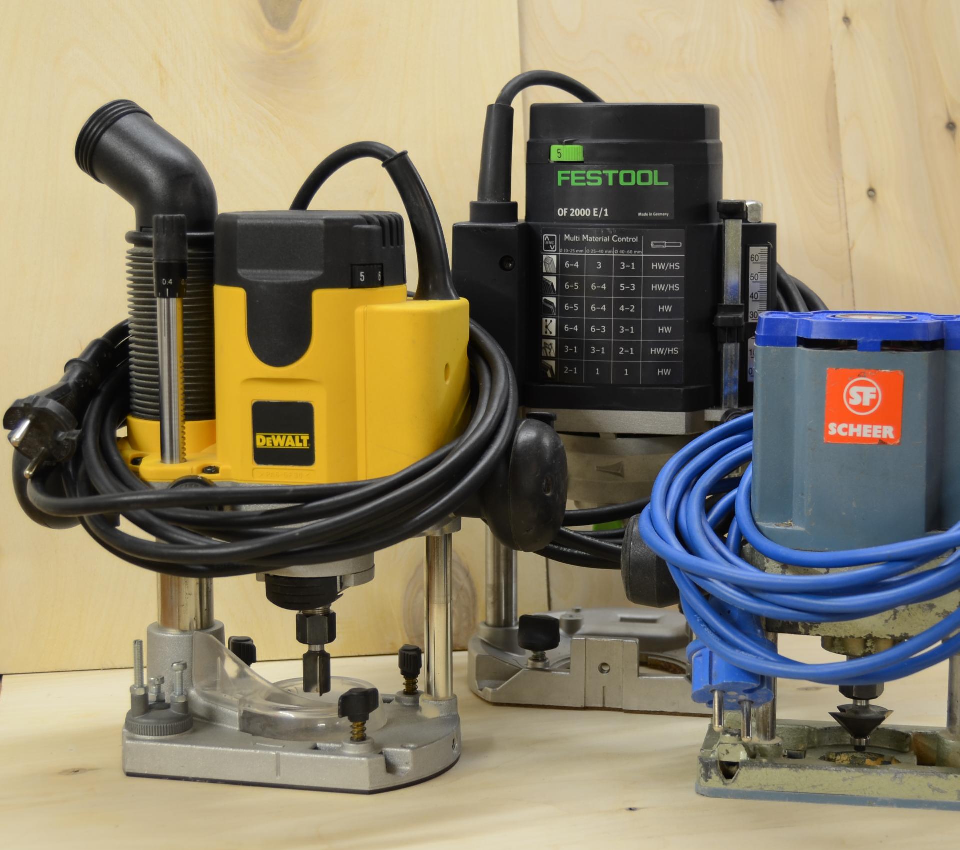 - diverse Oberfräsen von 500-1800W samt breitem Sortiment an Fräsern (für alle möglichen Nut-, Einsetz- und sonstigen Arbeiten),