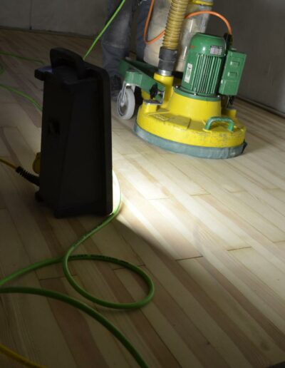 - eine Planetenschleifmaschine (Lägler Trio, LED-Beleuchtung nachgerüstet), die für eine sehr plane Fläche und ein gleichmäßiges Schliffbild sorgt, für spezielle Fälle in der Untergrundvorbereitung und für gebürstete Oberflächen einsetzbar ist,