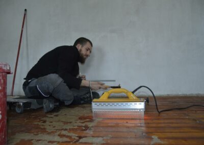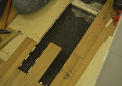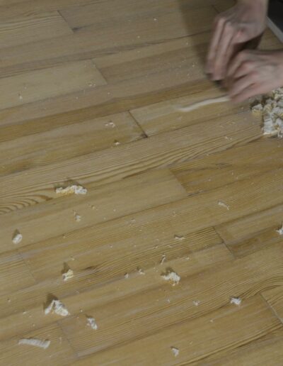 Das Schließen von Fugen kann auf vielfältige Weise geschehen, z.B. durch Einleimen von Spänen/Leistchen oder Kork oder durch das vorsichtige Rückbauen und Neuverlegen der kompletten Fläche. Bretterböden mit starker Wölbung können vorsichtig bearbeitet werden, um den Charakter zu erhalten oder aber plangehobelt und -geschliffen werden. Fußleisten können von uns ergänzt werden, ggf. fertigen wir auch alte Profile nach.