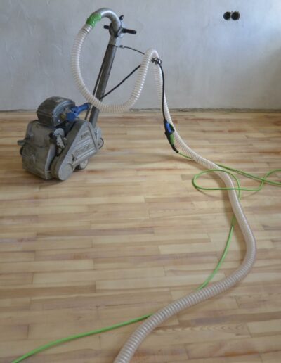 - Schliff und Erneuerung der Oberfläche: Dabei wird, je nach Zustand, mit möglichst geringem Materialbtrag die Oberfläche wieder plan und sauber geschliffen. Auch alte Lackoberflächen können so abgetragen werden. Druckstellen werden ggf. während der Arbeitsgänge mit Wasser und Wärme aufgequollen und verschwinden so ebenfalls. Abschließend erfolgt eine Behandlung der Oberfläche, z.B. mit Hartöl oder Hartwachsöl, meist in mehreren Arbeitsgängen.