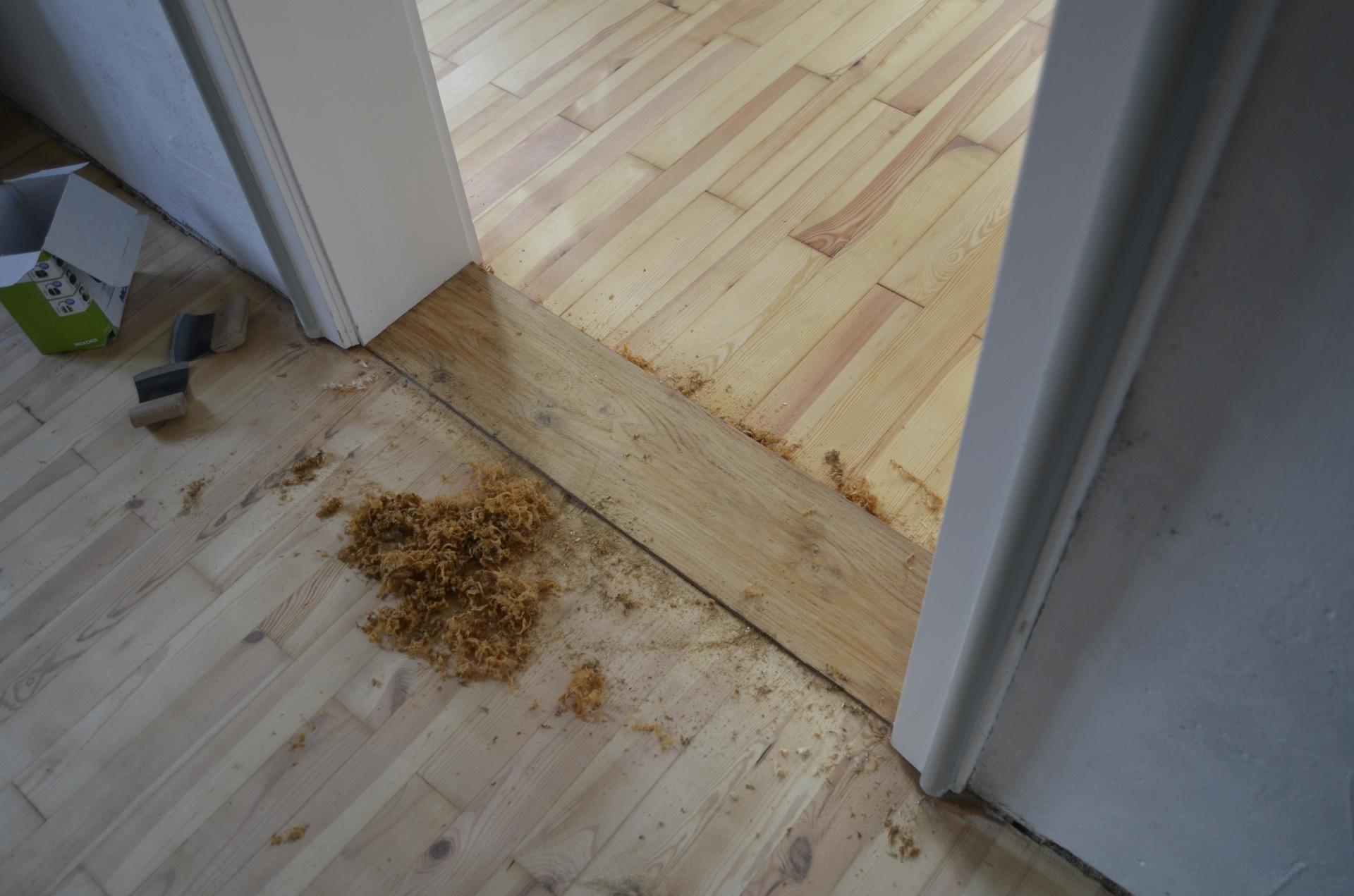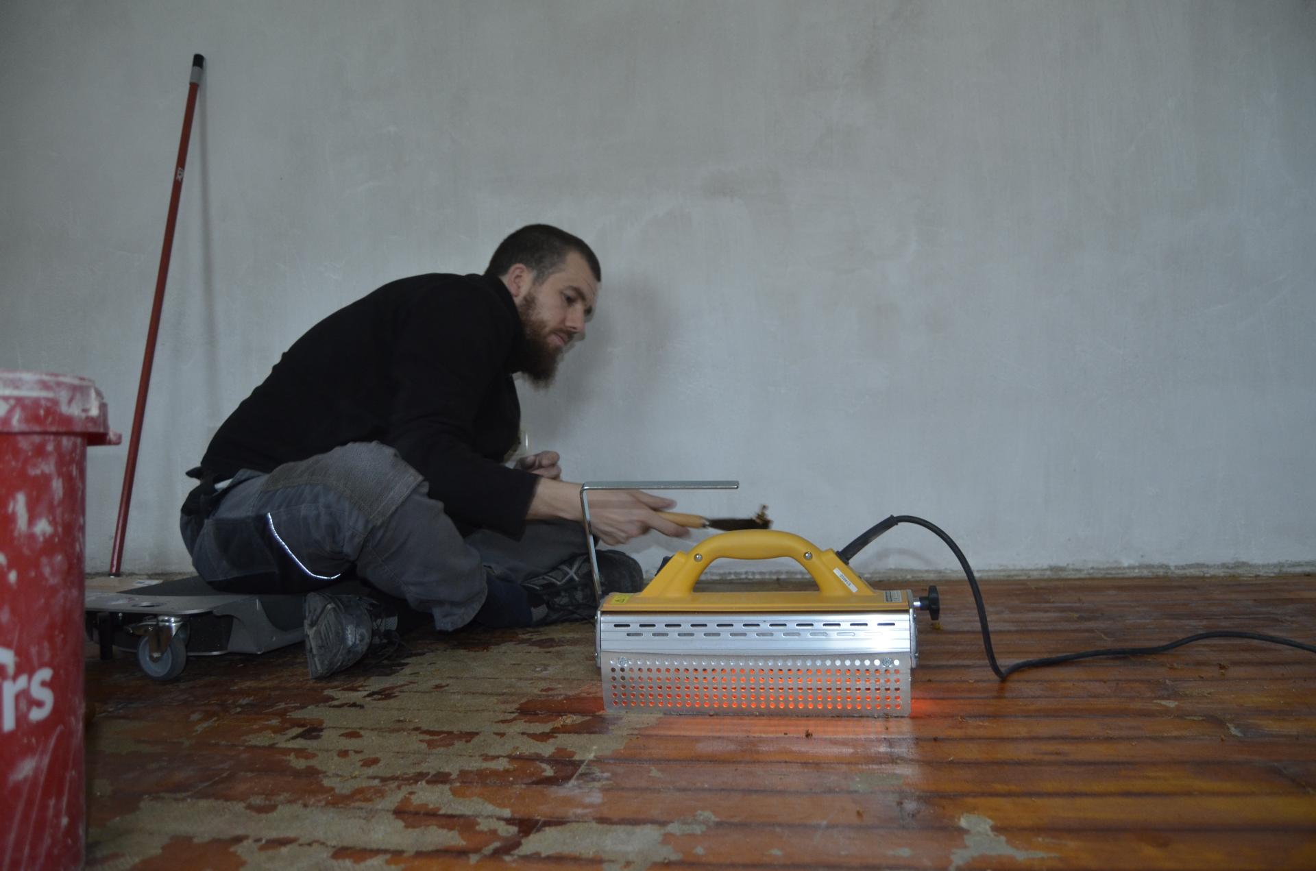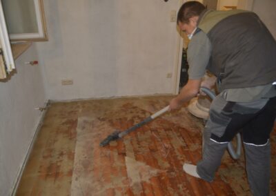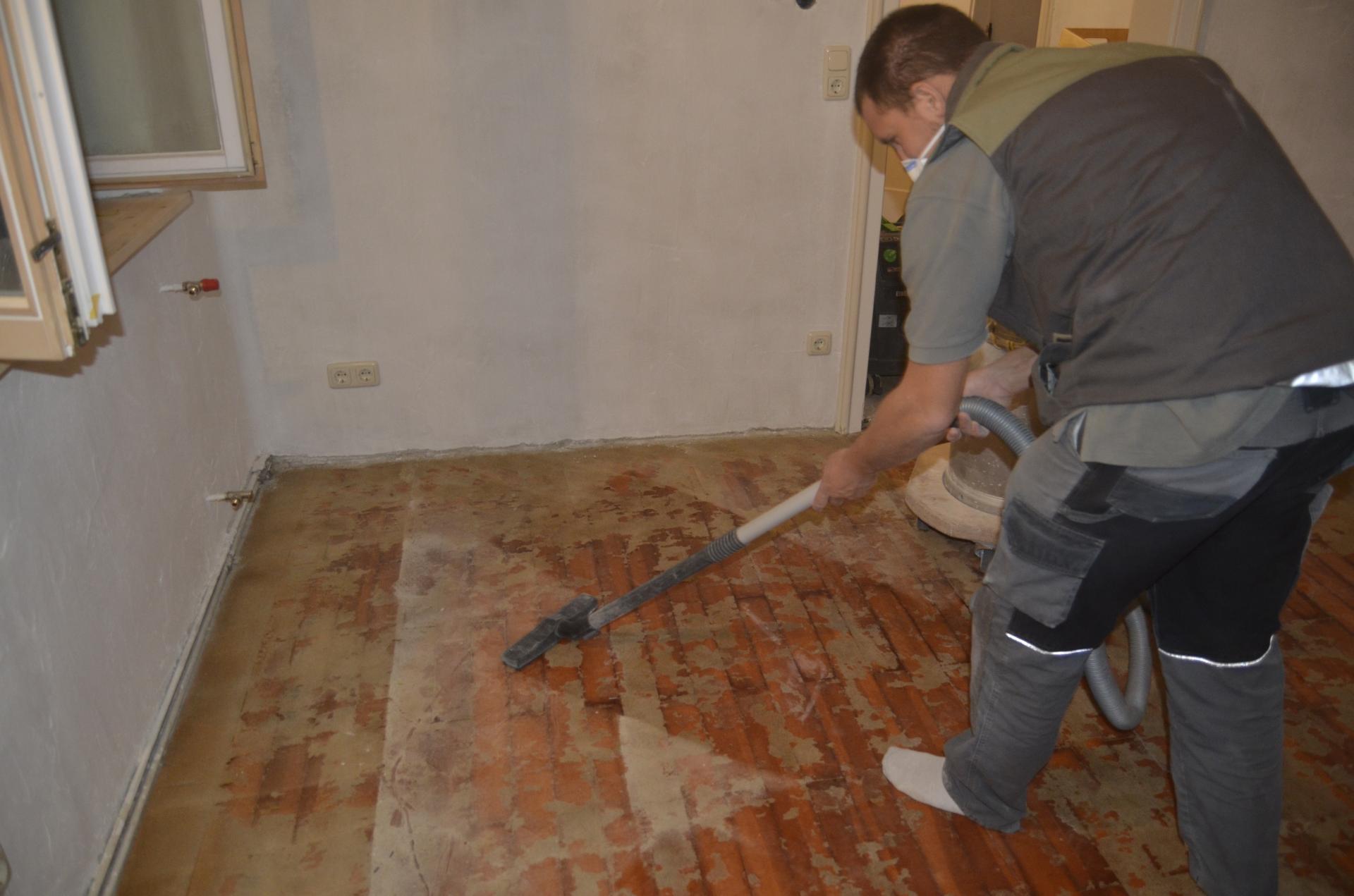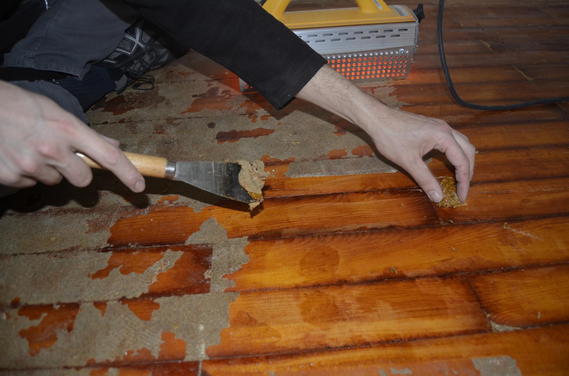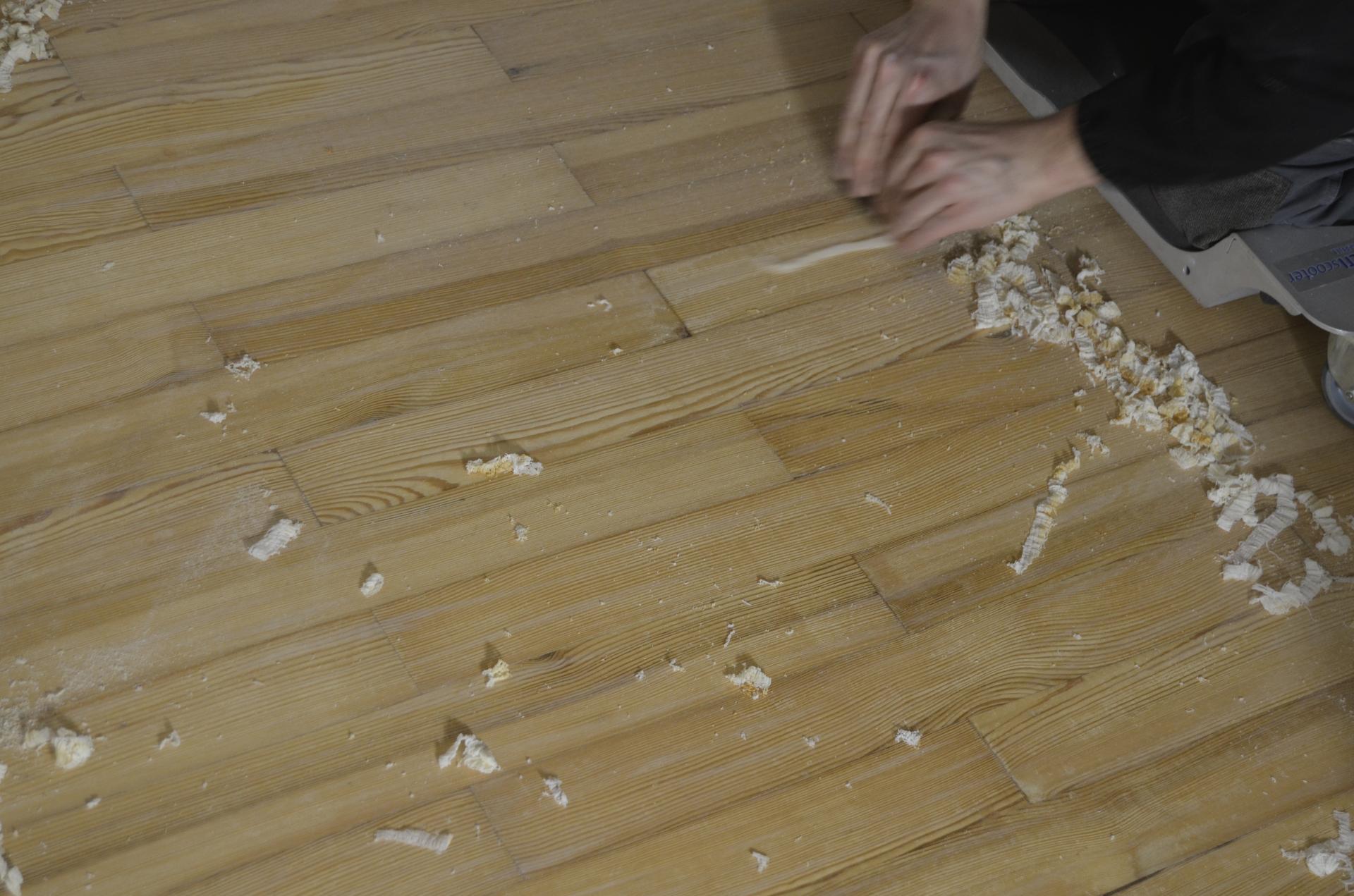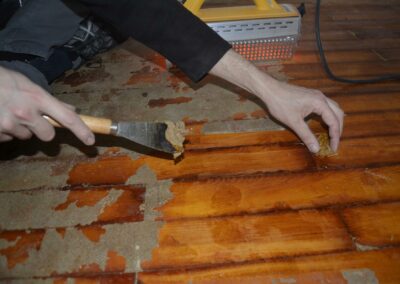 - Bei Renovierungen, bei denen z.B. alte Teppichböden oder Fliesen von einem Holzboden entfernt werden, muss der Kleber vor dem Schliff entfernt (z.B. kalt oder nach Erwärmung abgeschabt, abgefräst) werden. Sollten danach Beschädigungen sichtbar werden, sind diese natürlich umgehend instandzusetzen.