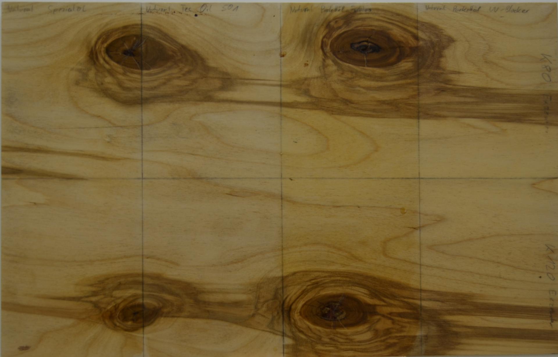 - Die Haltbarkeit natürlicher Oberflächenbehandlungen ist unterschiedlich gut, manche Öle und Harze verändern den Farbton des Materials deutlich.