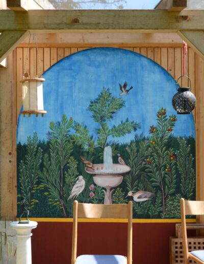 Unsere Kundin, die neben sehr fundierten (kultur)historischen Kenntnissen auch über eine nicht zu verleugnende künstlerische bzw, kunsthandwerkliche Begabung verfügt, hat die Felder der Laubengangs nach Vorbildern aus dem antiken römischen Reich bemalt. Nichts davon wurde gedruckt oder digital übertragen, die Bemalung ist ausschließlich das Ergebnis vieler gänzlich analoger Arbeitsstunden.