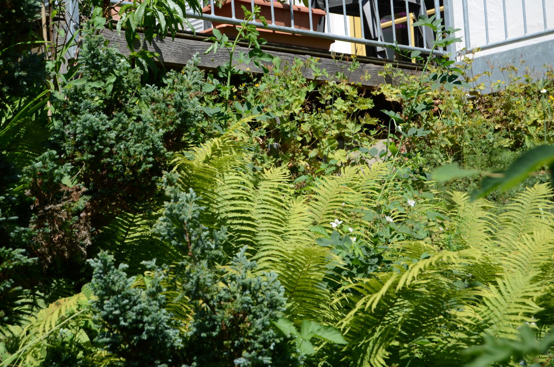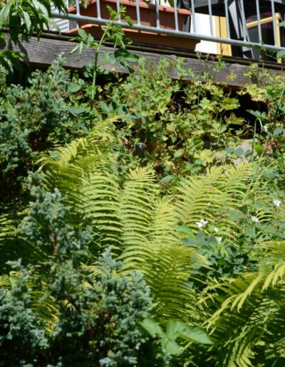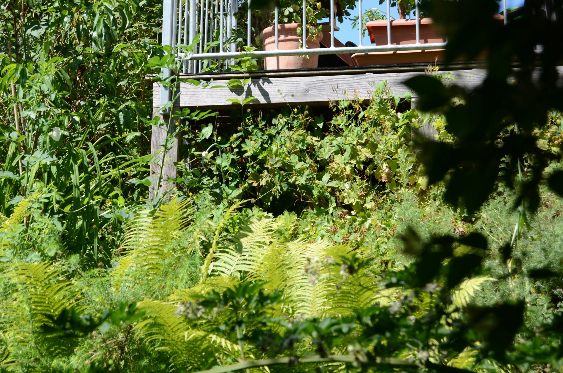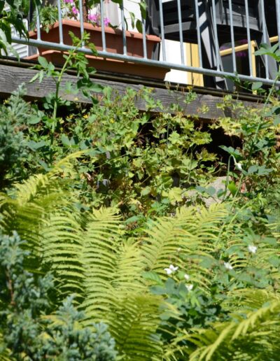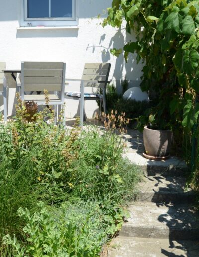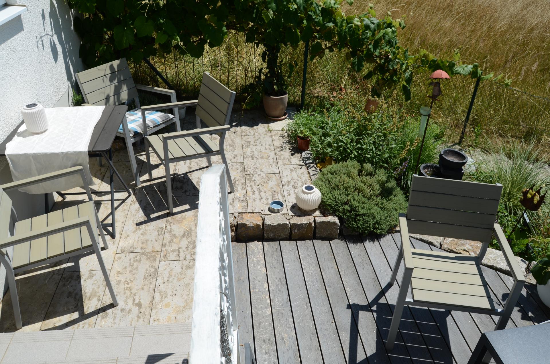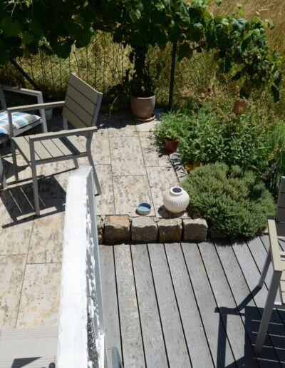 Die große Steigung des Geländes an dieser Stelle legte eine Gestaltung der Fläche mit mehreren Ebenen nahe. Der steilste Bereich wurde mit einer Holzterrasse (Dielen aus Eiche, grau geölt) auf einer Holz-Unterkonstruktion versehen, die einseitig an der Hauswand befestigt werden konnte. Der entstehende Hohlraum wurde durch eine Trockenmauer verschlossen, bleibt somit aber dennoch gut belüftet.
