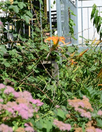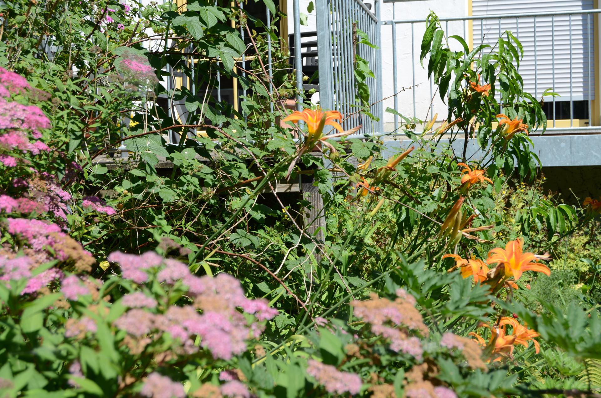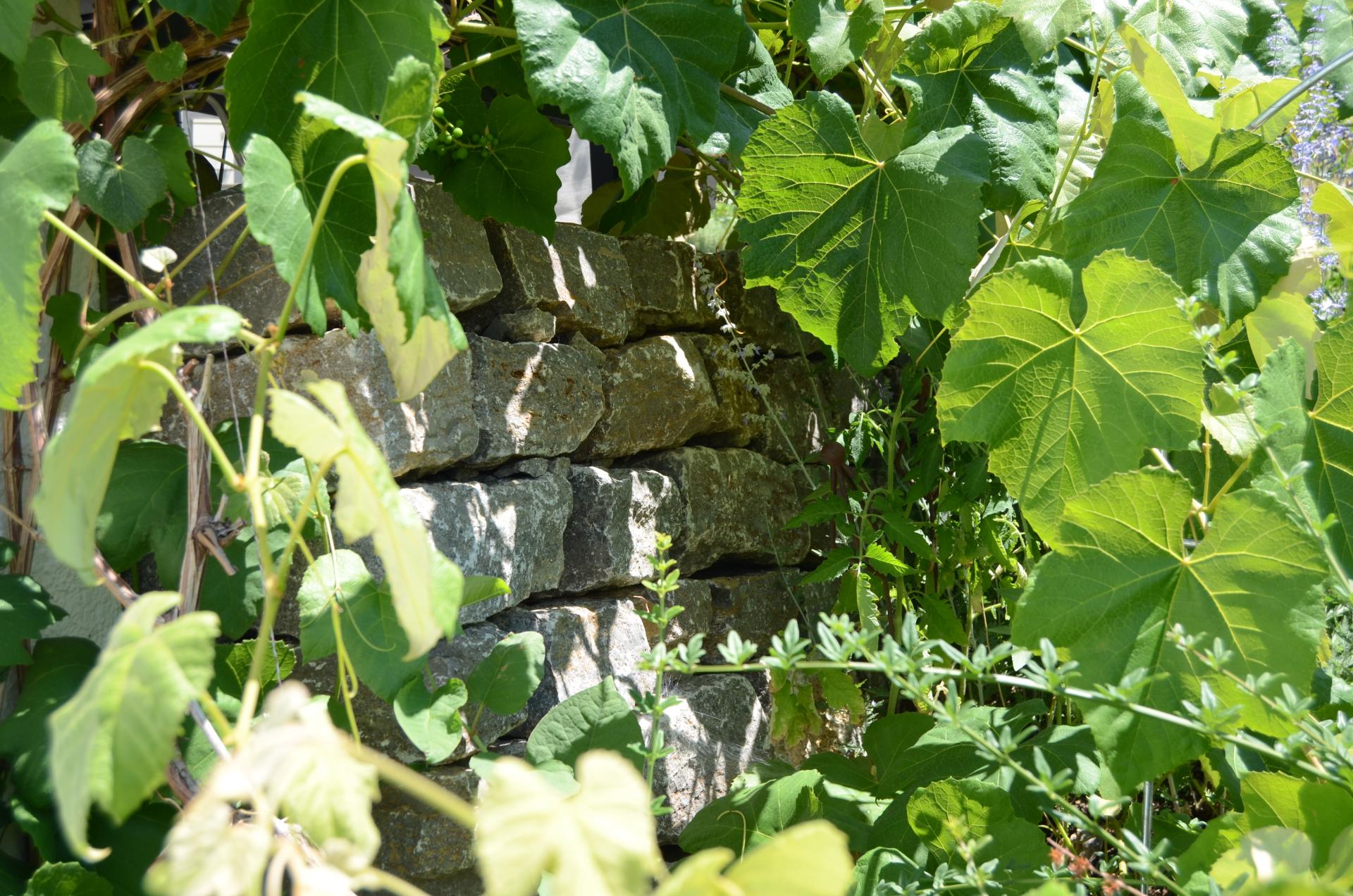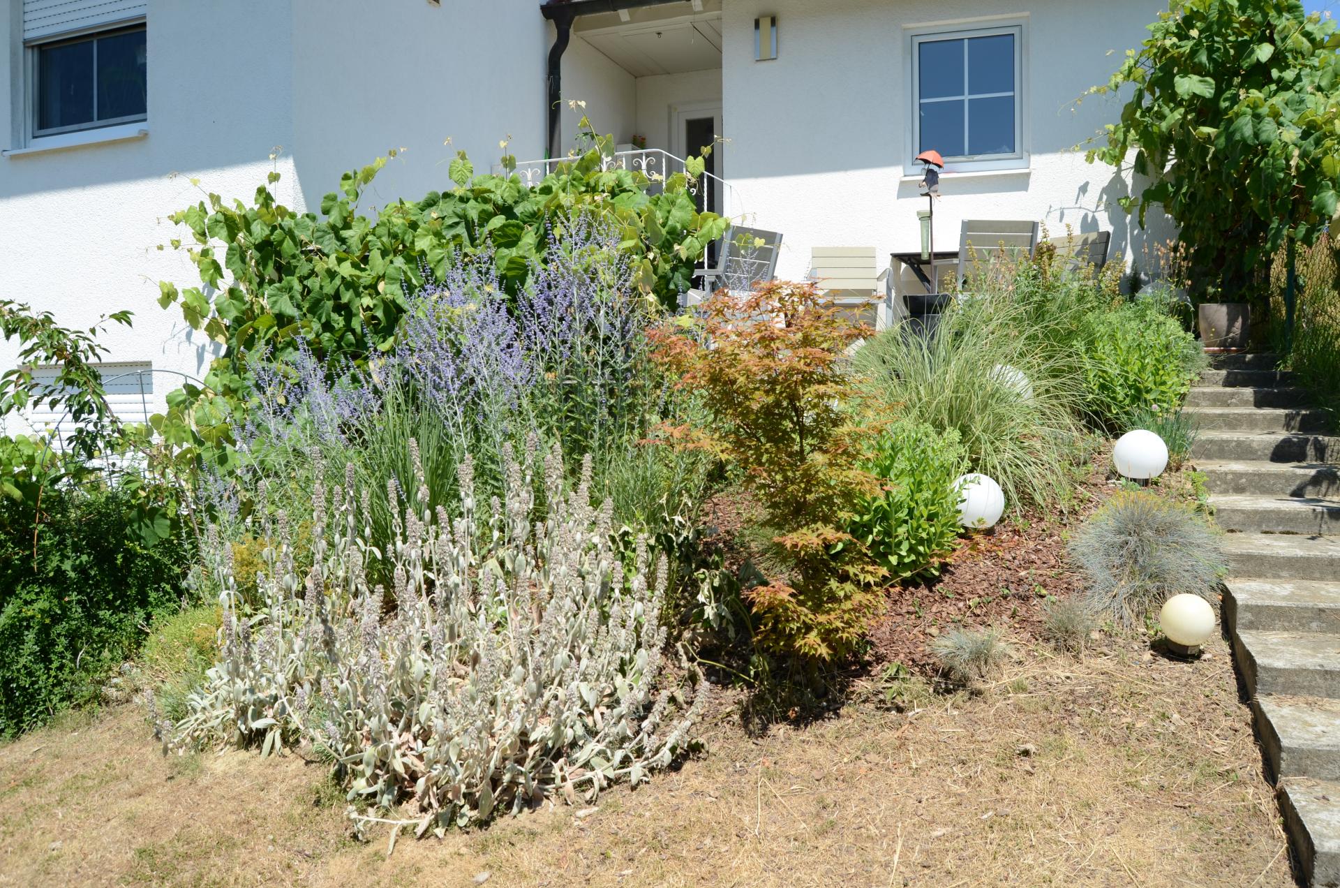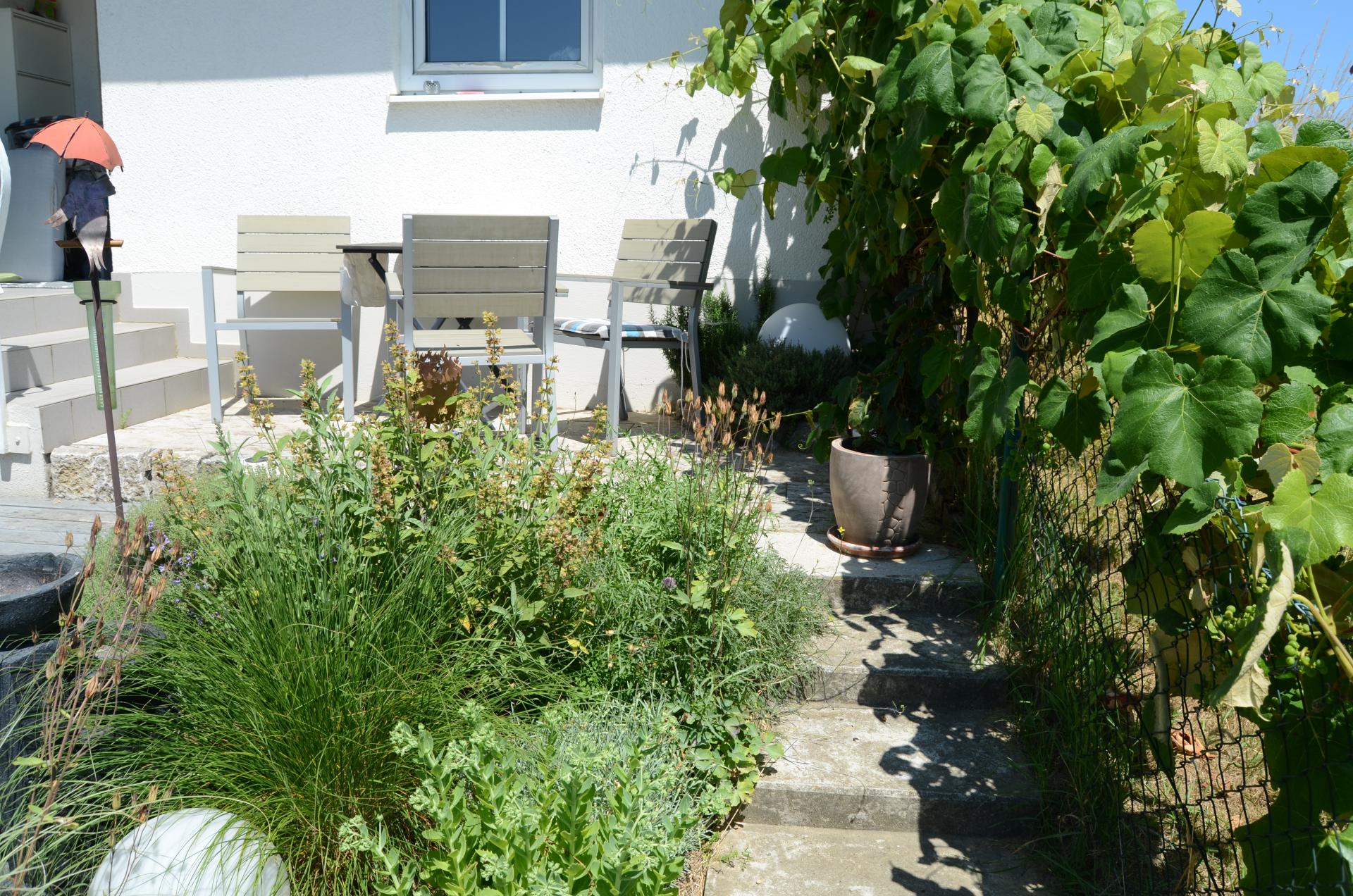 Die Bepflanzung ist zum Teil Altbestand (Weinstöcke) und zum Teil neu durch die Kundin angelegt.