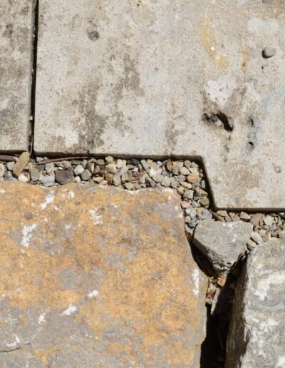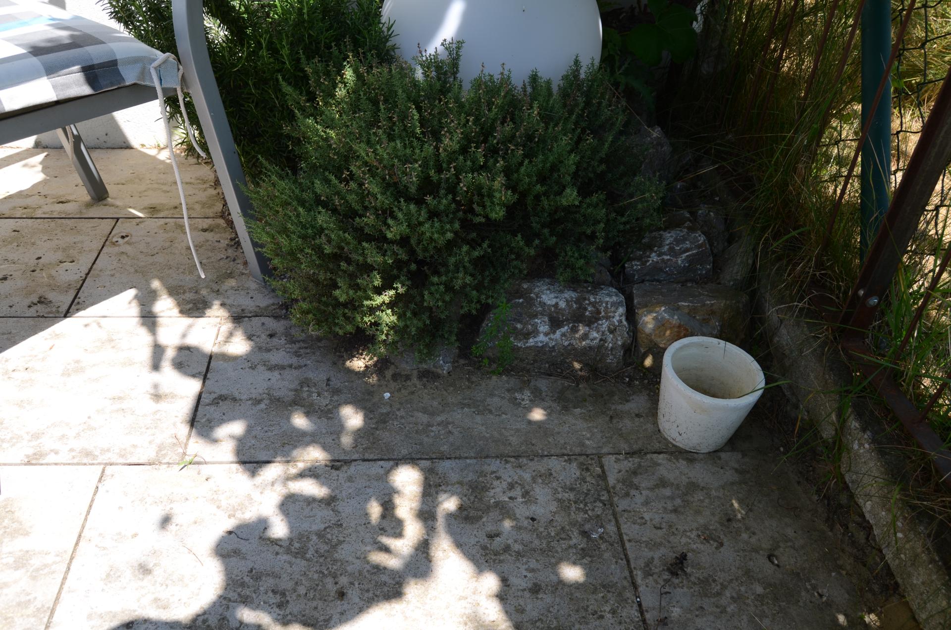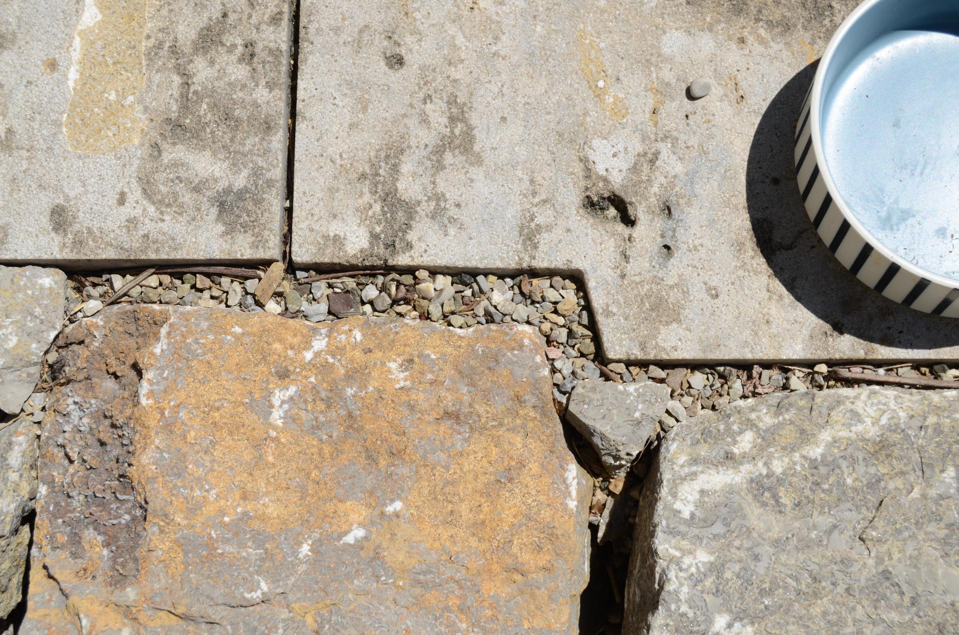 Ans Haus angrenzende Beton-Gehwegplatten, deren Untergrund sich gesetzt hatte, wurden ersetzt durch Natursteinplatten mit neuem Unterbau, die zu einer kleinen weiteren Ebene gestaltet wurden. Der Wachenzeller Dolomit harmoniert dabei gut mit der Kirchheimer Muschelkalk, aus dem die Trockenmauer und der Rand der Fläche gebaut wurden.