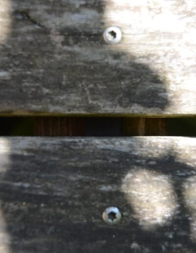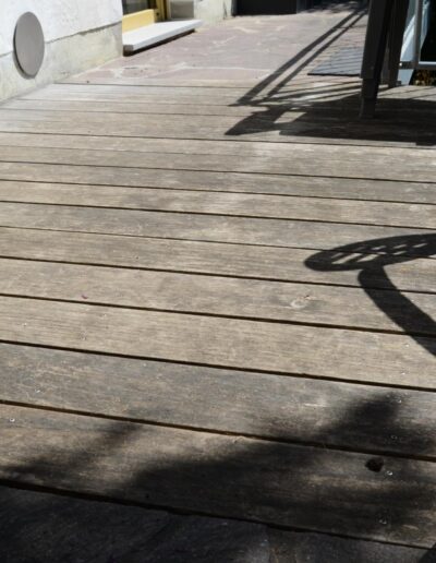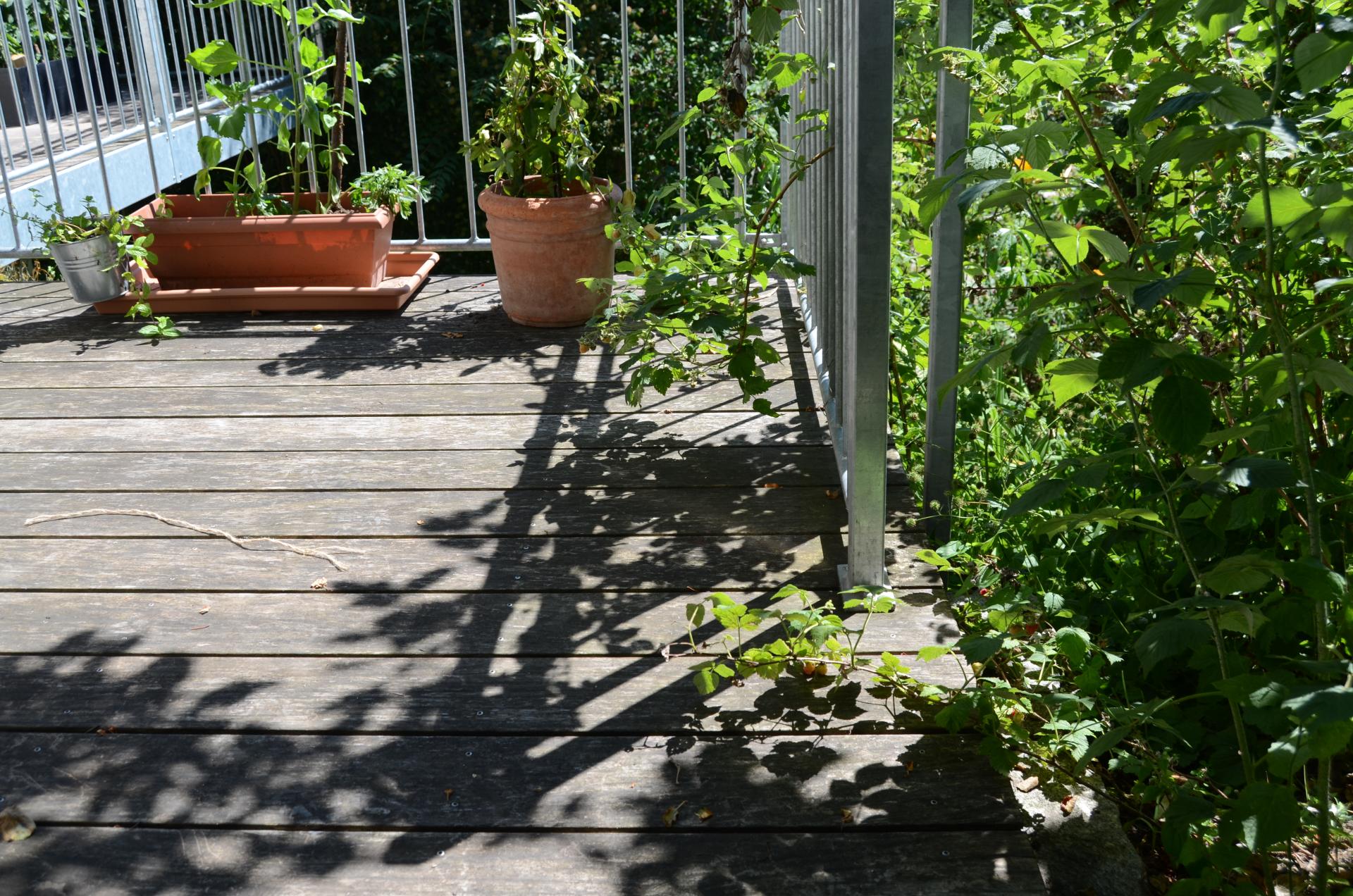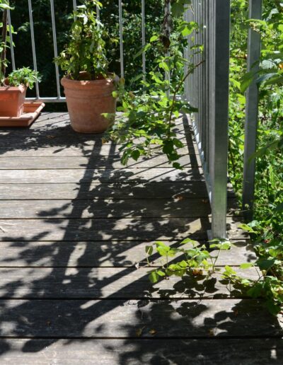 Wir haben an dieser Stelle, die wie die oben vorgestellte Terrasse ebenfalls am Hang liegt, eine Fläche aus Themopappel geschaffen, die auf einer Unterkonstruktion aus Lärche ruht. Die komplette Konstruktion wurde hierbei auf bestmöglichen konstruktiven Holzschutz ausgelegt; alle Schrauben sind aus Edelstahl. Die Stützen sitzen auf hohen justierbaren Stützenfüßen aus Stahl und damit außerhalb der Spritzzone.