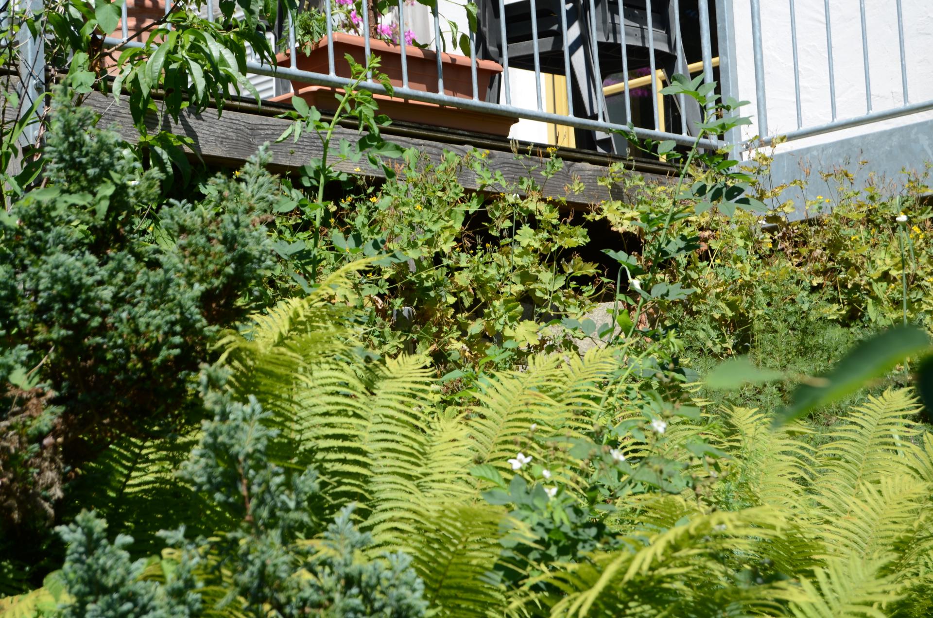 Am Rand des Hanggrundstücks hinter der Garage gelegen wurde dieser Bereich, den wir für unsere Kundin neu gestaltet haben, vorher einige Jahre als Außengehege für Kaninchen verwendet. Der Hang hatte also einige Gänge und Hohlräume, die im Lauf der Arbeiten zu verfüllen waren.